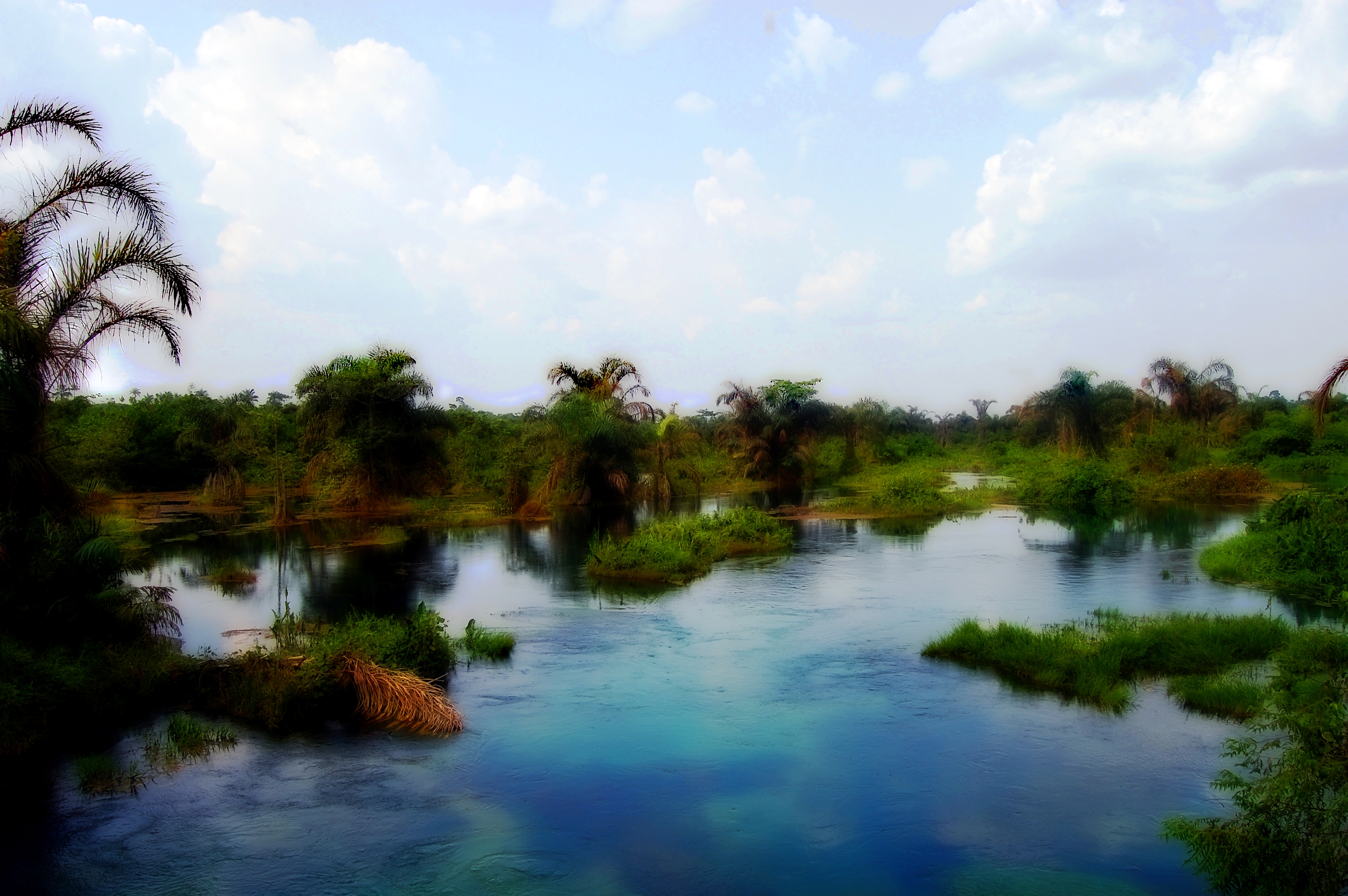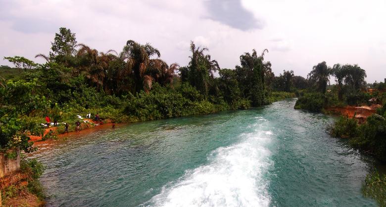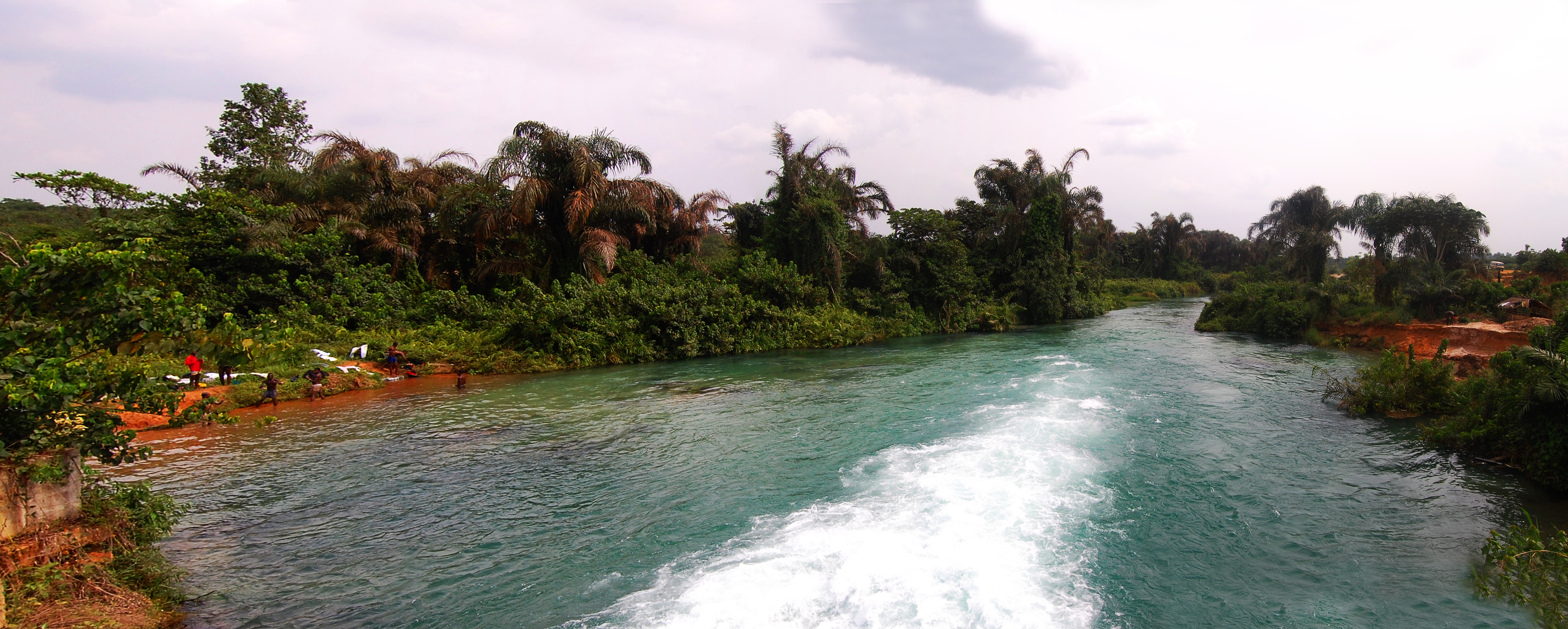 | The "fast side" of the washing stream. We were told there are monkeys living in the trees along the stream, though we didn't get a chance to see them. (extra credit if you can spot the naked guy!) |
